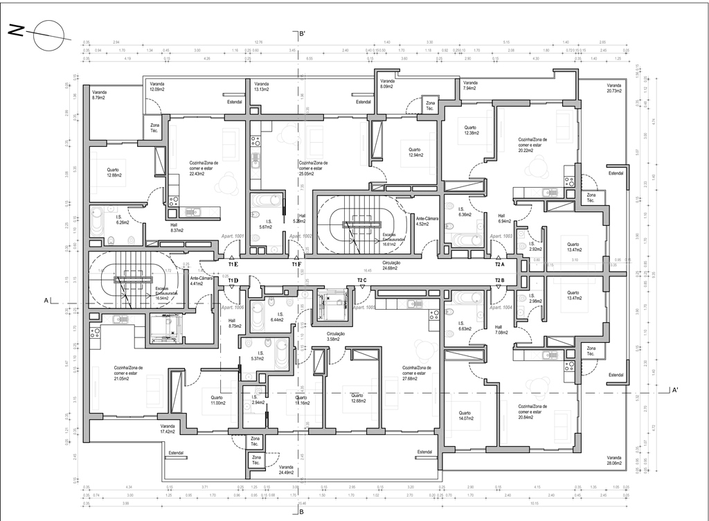 Nas casas de banho: loiças sanitárias suspensas, balcões de lavatório suspensos, bases de chuveiro, torneiras cromadas, espelhos de parede.
