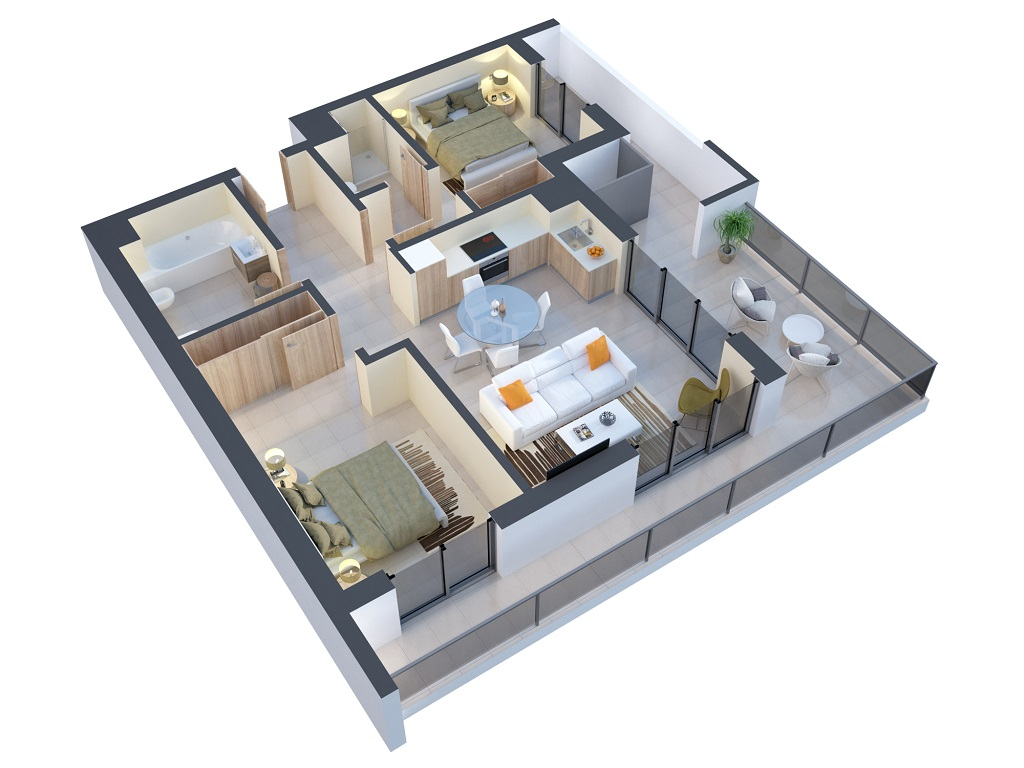 No interior dos apartamentos os acabamentos são de um luxo discreto e o ambiente é sedutor. As amplas varandas dispõem de uma excelente exposição solar e vista mar. As cozinhas com todos os electrodomésticos de encastrar, pronta a funcionar: forno, placa vitrocerâmica, exaustor, termoacumulador solar, micro-ondas, máquina de lavar roupa, máquina de lavar loiça e frigorifico combinado, lava-loiça de encastrar em inox.