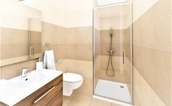 В ванных комнатах: подвесная сантехника, подвесные умывальники, душевые, хромированные краны (производства Испании), керамическая плитка, настенные зеркала, подвесной потолок со встроенными прожекторами.